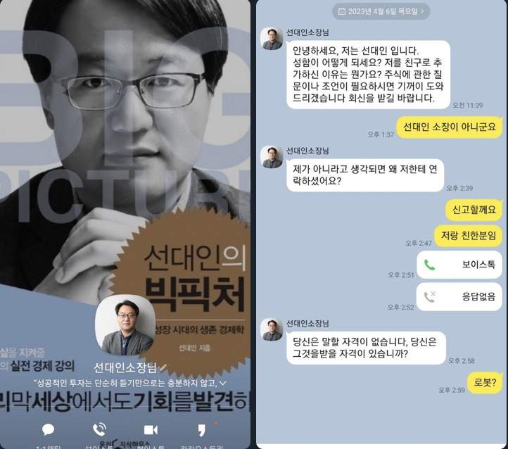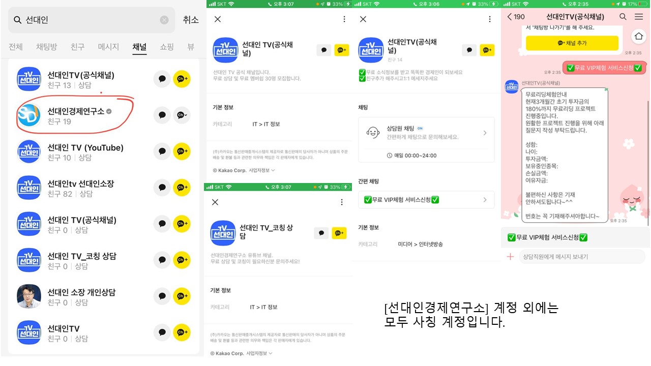 저희 연구소는 구독회원들을 위해 보고서를 발간하는 한편 구독회원들과 소통하기 위한 비공개 텔레그램 채널 외에는 별도로 운영하는 계정이 없을 뿐만 아니라 절대 별도의 투자 상담을 진행하거나 리딩을 하지 않습니다. 그러니 선대인경제연구소 회원 및 선대인TV 구독자분들께서는 유념하시고, 피해자가 생기지 않도록 주변 지인들께도 꼭 알려주십시오. 마찬가지로 박순혁이사님을 사칭하는 계정도 많은 모양인데, 절대로 박이사님도 별도로 그런 계정을 운영하지 않는다는 점을 아울러 알려드립니다. 이들에 대해서는 저희가 필요한 법적 조치를 취할 계획입니다. 또한 여러분들께서도 이런 계정을 발견한다면 저희 연구소로 제보해 주시기 바랍니다. 감사합니다.
