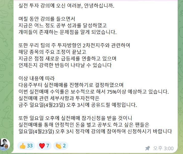 최근 한 텔레그램 채널은 저희 연구소 이름으로 '투자실전수업'을 운영하고 있는 것으로 확인하였는데, 이는 저희 연구소에서 운영하는 채널이 아니므로 절대 참여 하지 마시기 바랍니다.